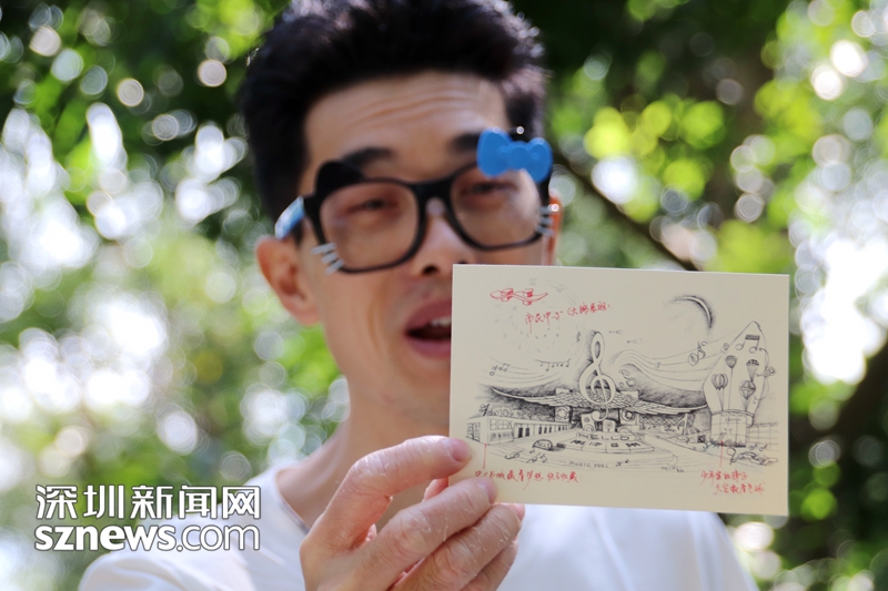 青松告訴記者,2008年剛到深圳時(shí),他就被市民中心的造型所吸引,畫(huà)下了上面這幅畫(huà)