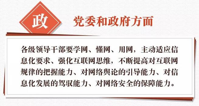 要形成黨委領(lǐng)導(dǎo)、政府管理、企業(yè)履責(zé)、社會(huì)監(jiān)督、網(wǎng)民自律等多主體參與,經(jīng)濟(jì)、法律、技術(shù)等多種手段相結(jié)合的綜合治網(wǎng)格局。要加強(qiáng)網(wǎng)上正面宣傳,積極培育和踐行社會(huì)主義核心價(jià)值觀。