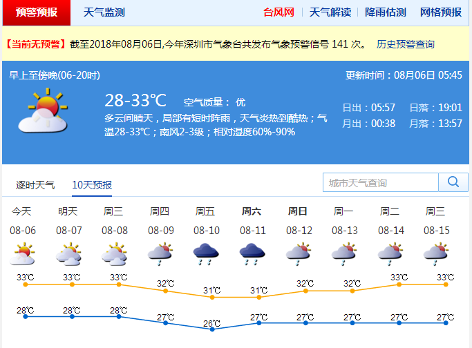 多云仍是今日深圳天氣的主格調(diào),部分時間陽光猛烈,局部還會出現(xiàn)短時陣雨或雷陣雨。氣溫較高,最低氣溫在28℃左右,最高氣溫升至33℃左右,北部及人口密集區(qū)的氣溫將達34-35℃。外出應(yīng)注意防曬,中午前后應(yīng)減少戶外活動。