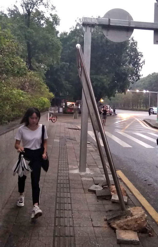 存在安全隱患的不僅電線桿,記者在蓮花山公園附近一人流量較大的十字街頭發(fā)現(xiàn),有一塊交通路牌也被“山竹”吹的東倒西歪,其底部根基已經(jīng)翻出一半,讓人擔心其會隨時倒下、危及過往路人安全。“我每天上下班都會經(jīng)過這里,騎著車又不得不走路牌內(nèi)側(cè),每次都有點小怕,擔心牌子會突然倒下砸到我?!备浇木用裣蛴浾咄虏鄣?。