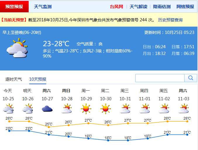 本周中后期,深圳早晚清涼,中午炎熱,最高氣溫維持在28-29度,最低氣溫22-23度,溫差增大,市民應注意預防感冒。本周末,受南下的冷空氣影響,深圳最高氣溫回落至26度左右,天氣較為舒適。