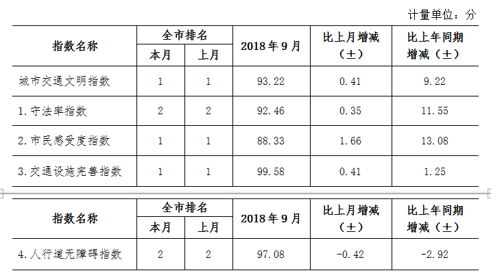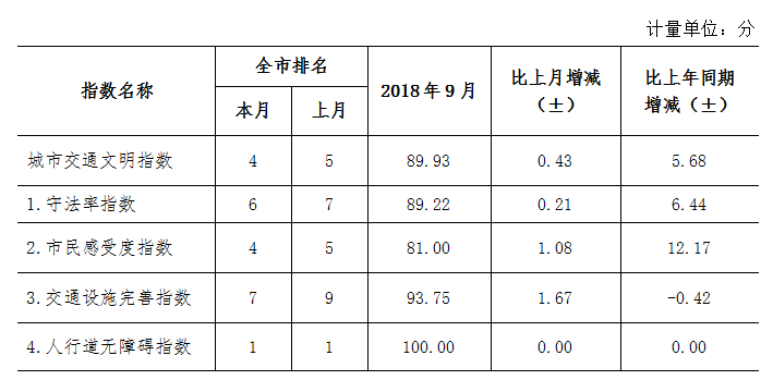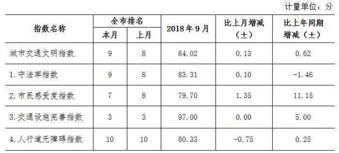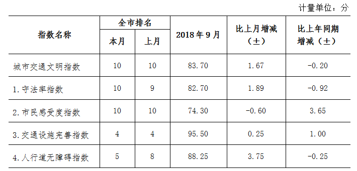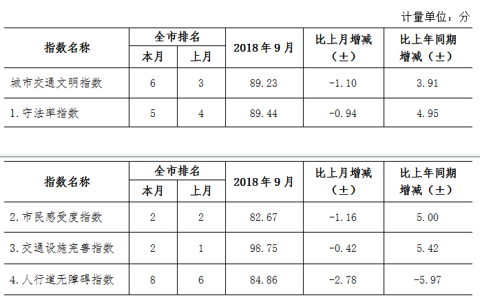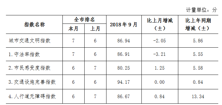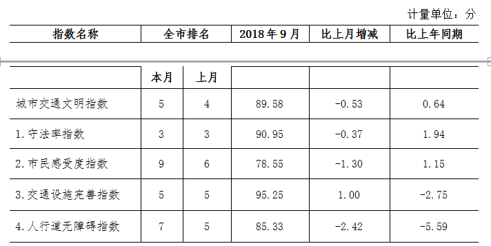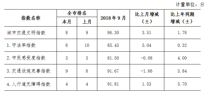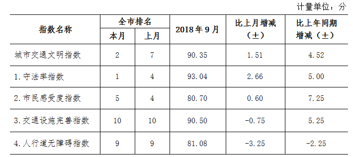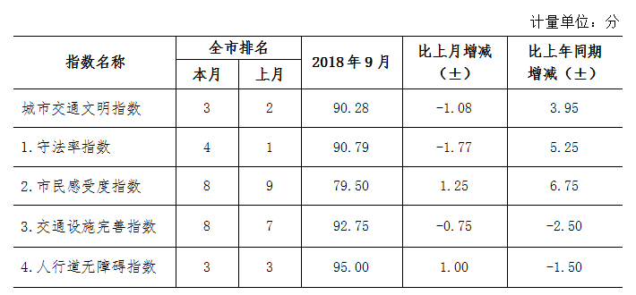 9月份深圳市城市交通文明指數為87.02分。與上月對比,四項分項指數呈“三升一降”現象。