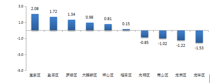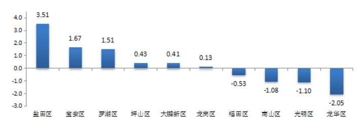 從各區(qū)(新區(qū))城市交通文明進步指數來看,福田區(qū)、羅湖區(qū)、鹽田區(qū)、寶安區(qū)、坪山區(qū)和大鵬新區(qū)均有所進步,其中寶安區(qū)進步最大,進步指數為2.08%,鹽田區(qū)次之,進步指數為1.72%;而南山區(qū)、龍崗區(qū)、光明區(qū)和龍華區(qū)則有所退步,其中龍華區(qū)和龍崗區(qū)退步較大,進步指數分別為-1.53%和-1.22%(見圖4)。