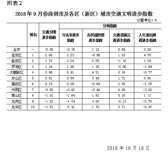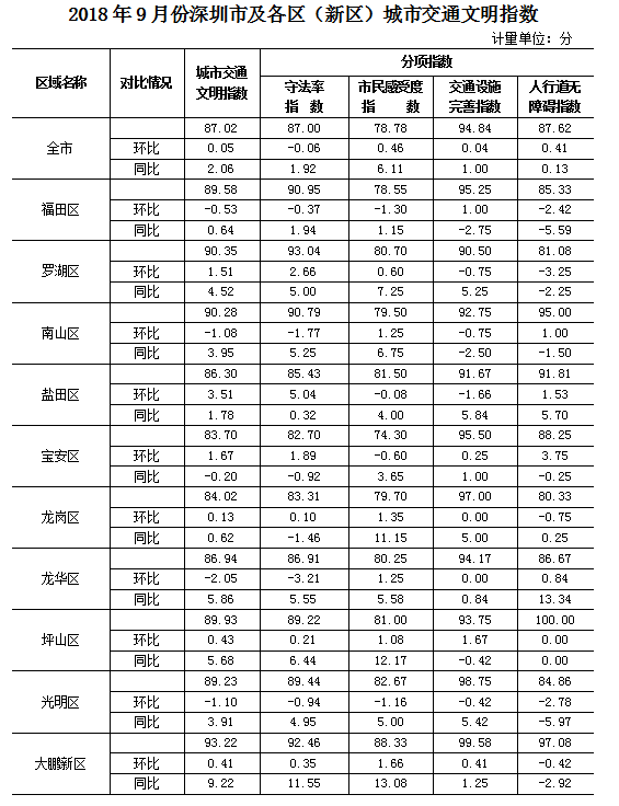 2018年9月份深圳市及各區(qū)(新區(qū))城市交通文明指數