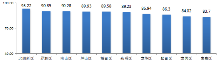 從各區(qū)(新區(qū))城市交通文明指數來看,大鵬新區(qū)得分最高,為93.22分,羅湖區(qū)和南山區(qū)得分均在90分以上,龍崗區(qū)和寶安區(qū)得分較低,分別為84.02分和83.70分,其他區(qū)得分在86.00-90.00分之間(見圖2)。