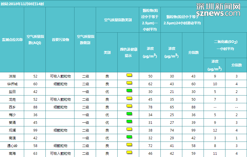 深圳市人居環(huán)境委員會于2018年11月8日14時(shí)發(fā)布空氣質(zhì)量時(shí)報(bào)