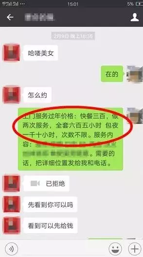 受害人看到招嫖信息主動聯(lián)系時,騙子立即承諾服務(wù)內(nèi)容,讓受害人悠然神往,喪失理智。