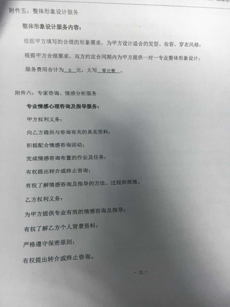 劉小姐提供的合同增值服務內容,包含心理咨詢,個人宣傳片等服務。