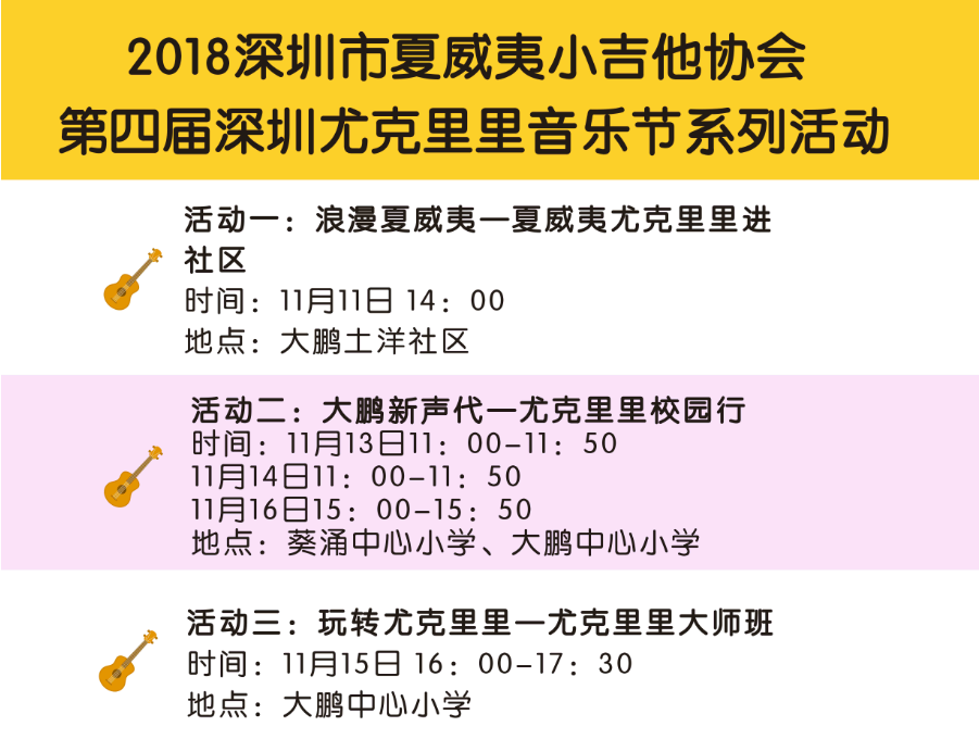 深圳新聞網(wǎng)訊 11月11日至17日,《2018大鵬文化季》音樂藝術(shù)周將迎來深圳大鵬尤克里里音樂嘉年華,也是深圳市夏威夷小吉他舉辦的第四屆深圳尤克里里音樂節(jié)慶活動,本屆嘉年華落戶深圳大鵬,與大鵬的海洋文化氣質(zhì)不謀而合,嘉年華將會有音樂會、校園行、公開課和尤克里里呼拉舞進社區(qū)等活動,分別在大鵬中心小學(xué),土洋社區(qū),玫瑰海岸等地舉行。