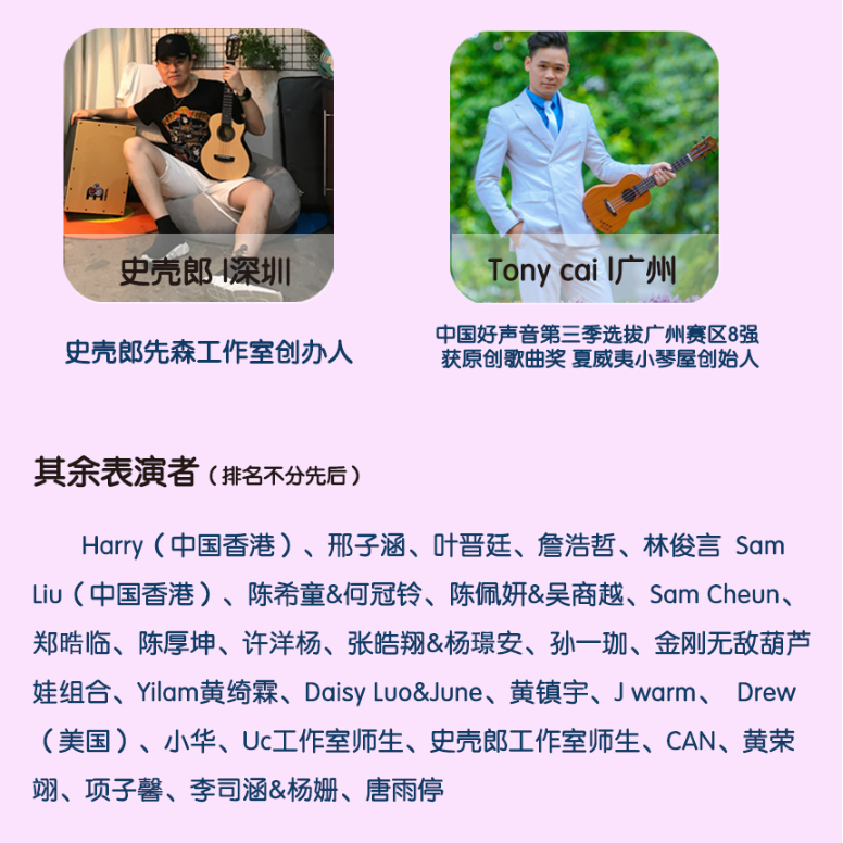 其中全民參與嘉年華音樂會11月17日的將會在深圳市玫瑰海岸沙灘舉辦,有深圳、香港(中國)、臺灣(中國)、美國、日本、廣州、中山、珠海等地的嘉賓和愛好者近50組表演者帶來4小時尤克里里盛會,表演者年齡跨度更是從5歲到60歲。嘉年華現(xiàn)場除了尤克里里音樂會,還將有Moana夏威夷呼拉舞風(fēng)情體驗,中國臺灣尤克里里協(xié)會會長陳建廷新書《兒童尤克里里英文暢游》深圳首發(fā),中國臺灣尤克里里世界大賽冠軍蔡皓怡原創(chuàng)專輯《航海日志》深圳首發(fā),以及美國尤克里里音樂家、藝術(shù)家新專輯《粉色海豚》尤克里里專輯中國大陸首發(fā)。