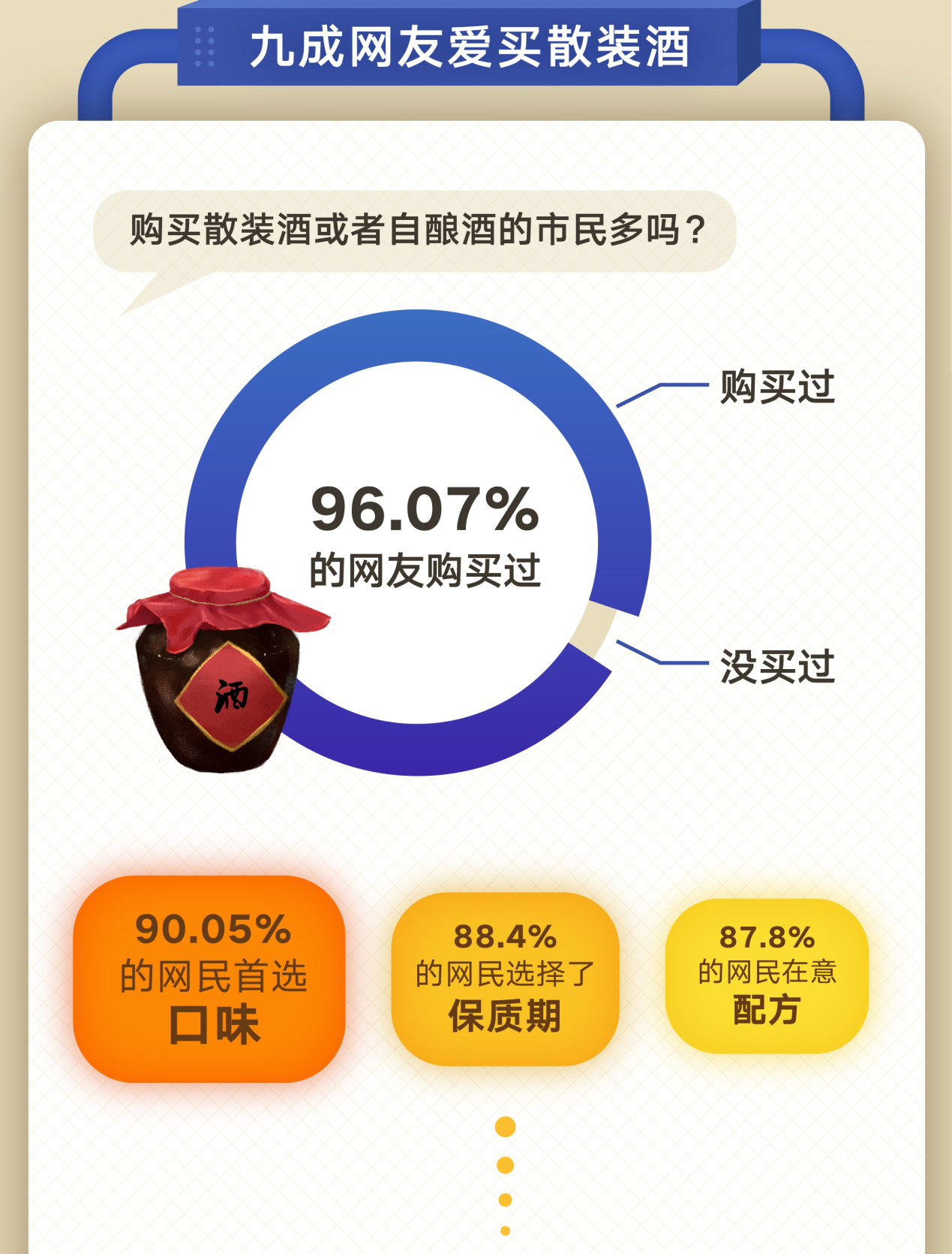 在深圳,購買散裝酒或者自釀酒的市民多嗎?根據(jù)此次調(diào)查數(shù)據(jù)顯示,高達96.07%的網(wǎng)友都曾購買過,可見散裝酒和自釀酒的受歡迎程度。 買散裝酒最看重什么?調(diào)查數(shù)據(jù)顯示,90.05%的網(wǎng)民首選口味;88.4%的網(wǎng)民選擇了保質(zhì)期;87.8%的網(wǎng)民在意配方,而對安全性關(guān)注的只有7.95%。