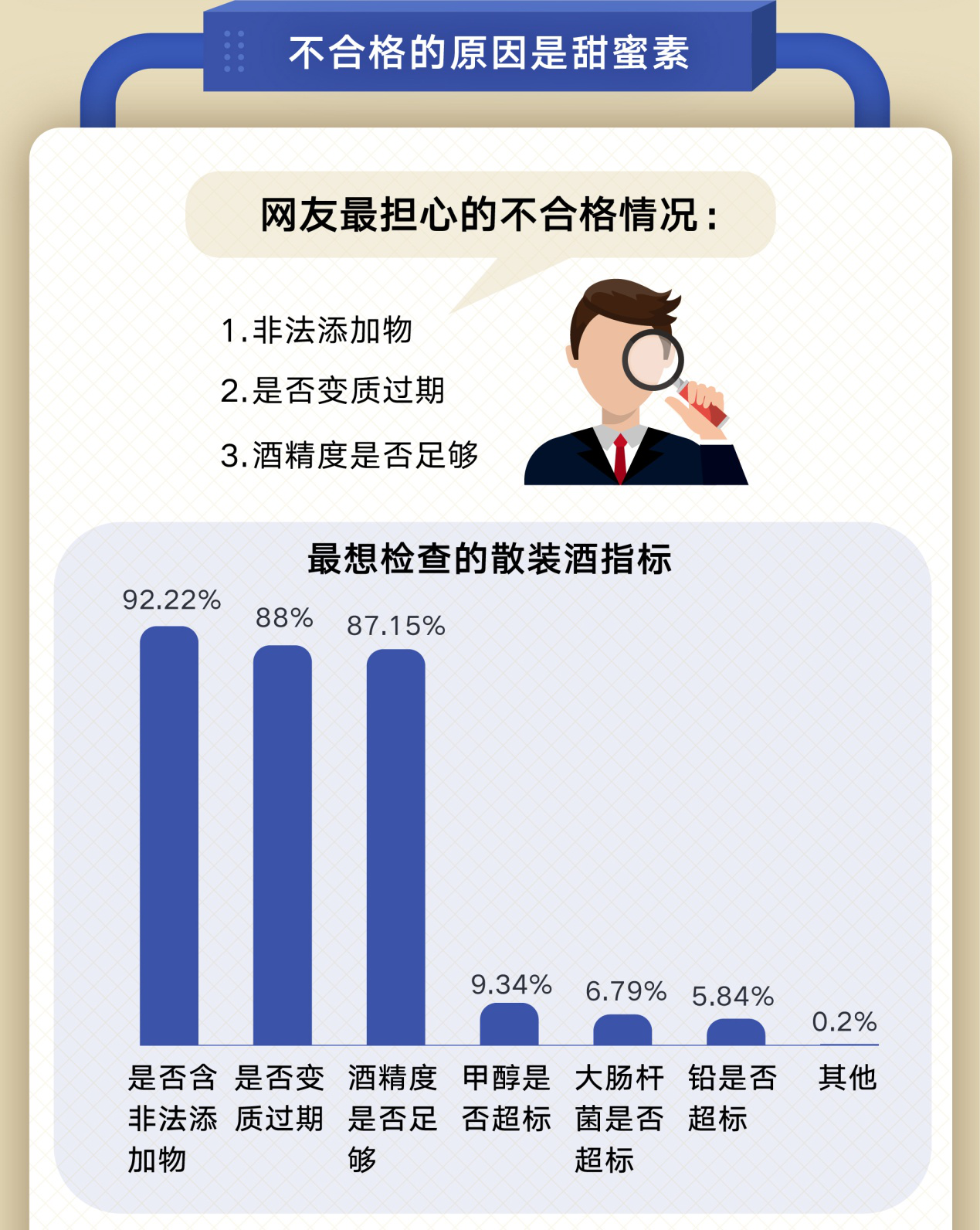 網(wǎng)友最想檢查的散裝酒指標(biāo)有哪些?根據(jù)調(diào)查數(shù)據(jù),網(wǎng)友最擔(dān)心的還是在散裝酒中的非法添加物;其次是酒水是否變質(zhì)過(guò)期;排在第三位的是酒精度是否足夠。