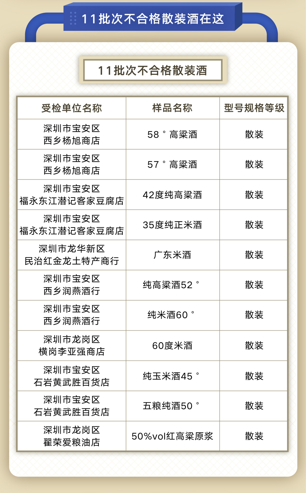 根據(jù)調(diào)查結(jié)果,此次共抽檢商行、酒行、煙酒店散裝酒水46批次,3批次不合格,合格率93.5%;抽檢商店、便利店、百貨店散裝酒29批次,5批次不合格,合格率82.8%。其他抽檢的散裝酒場(chǎng)所還有糧油店、豆腐店、土特產(chǎn)商店等。
