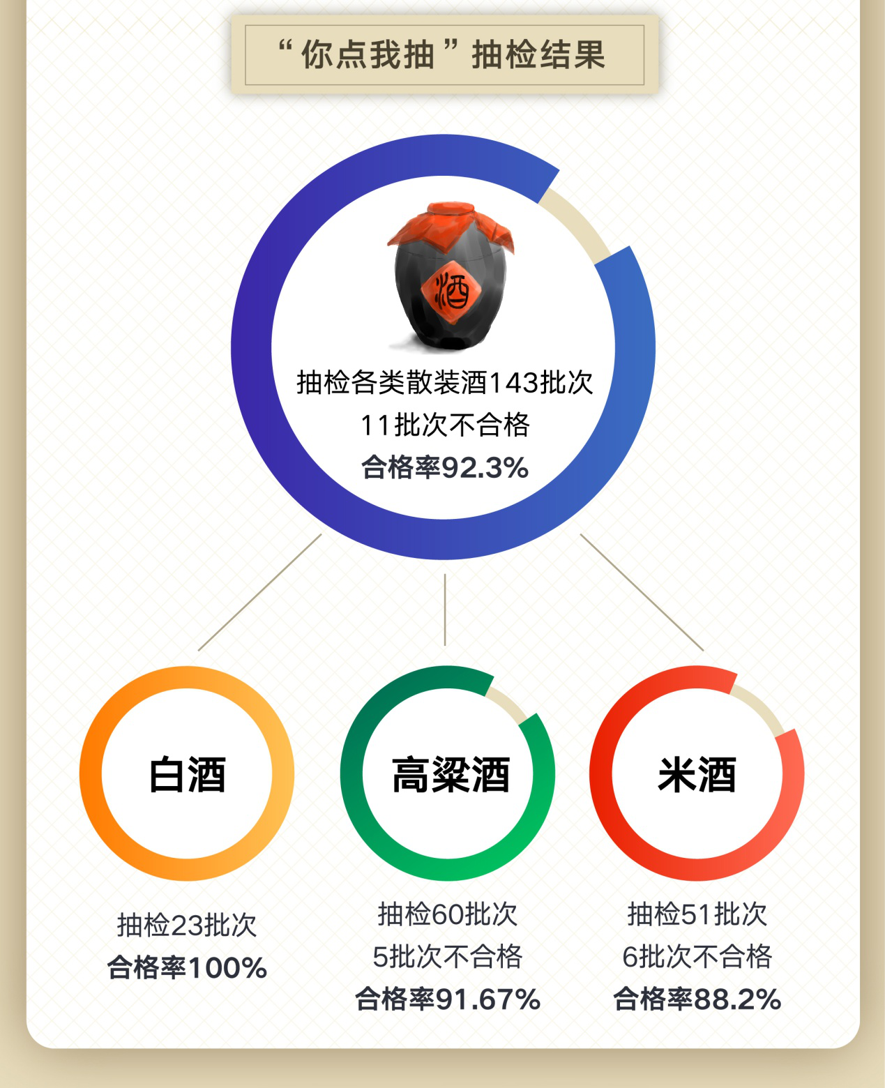 根據(jù)投票結(jié)果,此次共抽檢各類(lèi)散裝酒143批次,11批次不合格,合格率92.3%。其中,抽檢白酒23批次,合格率100%;抽檢高粱酒60批次,5批次不合格,合格率91.67%;抽檢米酒51批次,不合格6批次,合格率88.2%。
