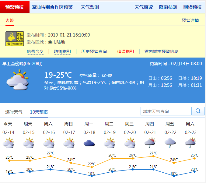 記者從深圳市氣象局了解到,14日深圳全市多云為主,氣溫19-25℃,相對濕度70%-90%,偏東風(fēng)2-3級,能見度8-18公里。值得一提的是,今天距離深圳平均入冬日:1月13日已經(jīng)過去一個月了,今年直接入夏的可能性越來越大。