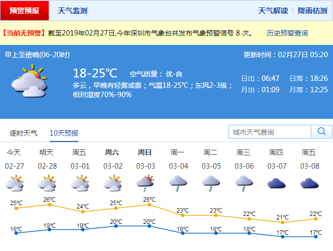 記者從深圳市氣象局了解到,27日深圳市以多云天氣為主,早晚有輕霧;氣溫回升,18-25℃。