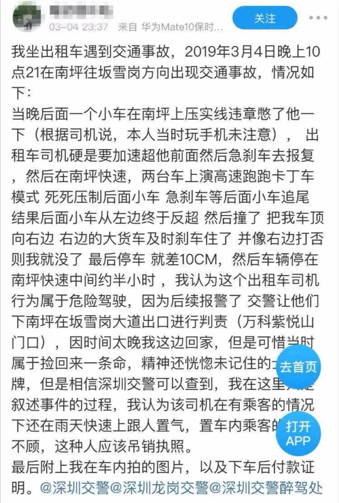 深廣電直播深圳2019年3月11日訊 近日有網(wǎng)友微博舉報(bào),3月4日晚其乘坐的一輛出租車與其他車斗氣引發(fā)交通事故,隨后深圳交警機(jī)動訓(xùn)練大隊(duì)對雙方司機(jī)進(jìn)行調(diào)查。