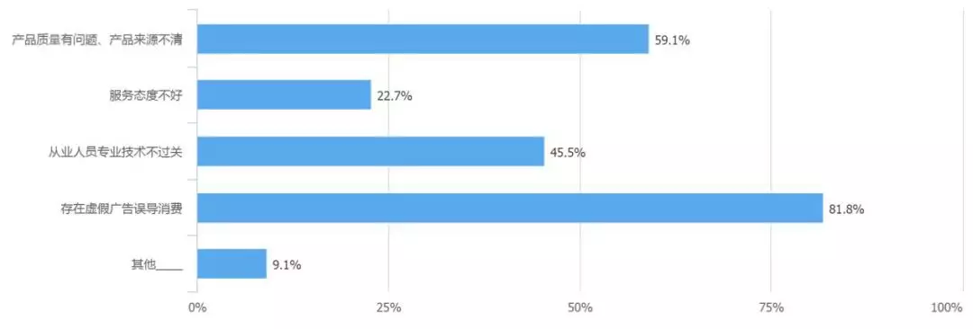 消費(fèi)者們認(rèn)為美容美發(fā)行業(yè)中存在最大的問題是虛假廣告誤導(dǎo)消費(fèi),第二則是產(chǎn)品質(zhì)量問題和產(chǎn)品來源不清。