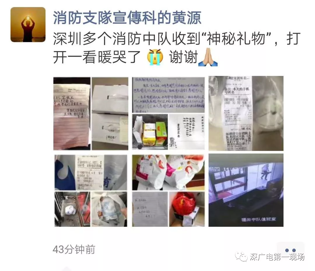 深廣電第一現(xiàn)場(chǎng)2019年4月5日訊 4月4日下午深圳的多個(gè)消防中隊(duì)涉及龍崗、坪山、公明、福田……都收到了一份“神秘禮物”,消防員們表示,打開(kāi)看了后,他們都暖哭了……