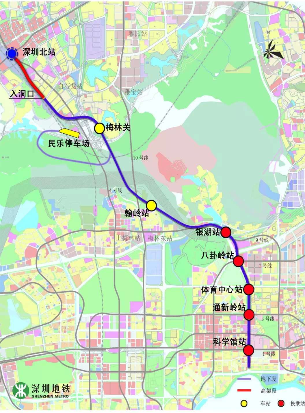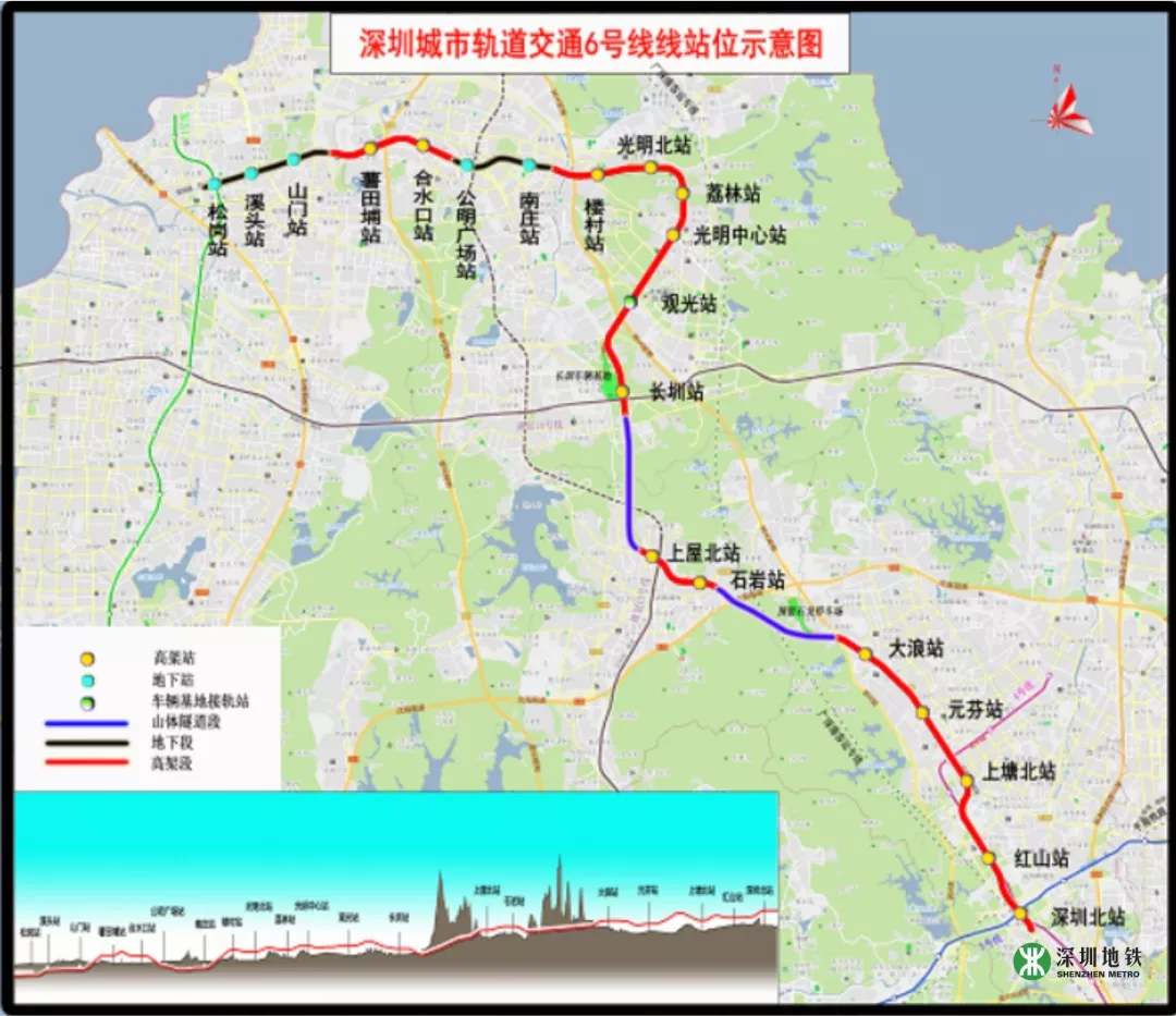 深圳地鐵6號(hào)線一期工程全長約49.4km,其中一期工程長約37.6km,起自深圳北站綜合交通樞紐,終止于松崗站,設(shè)車站20座(其中地下站5座,高架站15座),與4、5、11、13、15號(hào)線及廣深港客運(yùn)專線綜合換乘。