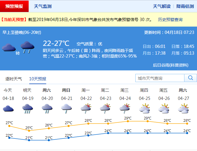 市氣象局預(yù)預(yù)計(jì),深圳今天午后轉(zhuǎn)(雷)陣雨,夜間降雨趨于頻密,19日有暴雨局地大暴雨,并伴有雷電和短時(shí)大風(fēng),20日仍有局地暴雨。強(qiáng)降水時(shí)請注意遠(yuǎn)離河道、低洼處等危險(xiǎn)區(qū)域;天氣節(jié)奏變化快,請關(guān)注氣象臺(tái)發(fā)布的最新氣象信息。