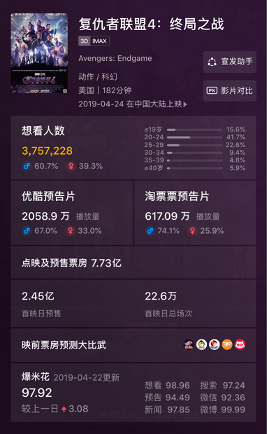 值得注意的是,淘票票×優(yōu)酷雙端合并平臺的“想看+預約”數(shù)超500萬,雙端預告片播放量破2600萬,打破進口片想看+預約”紀錄,成為全網(wǎng)第一。淘票票打造的“漫威社區(qū)”突破450萬訪問,“想看人數(shù)”達到370萬(如圖),想看、評分和評論都是平臺沉淀下的重要數(shù)據(jù),它代表著用戶粘性和平臺依賴度。