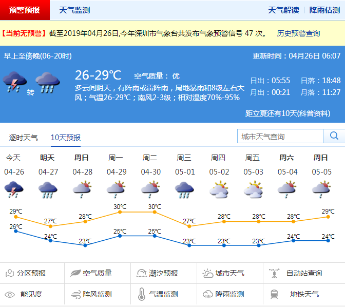深圳新聞網(wǎng)2019年4月25日訊(記者 陳婕)深圳已經(jīng)于2019年4月14日正式入夏,然而深圳夏季平均季長(zhǎng)達(dá)196天,現(xiàn)在都覺(jué)得熱了?還差得久呢!不過(guò)26-27日將會(huì)進(jìn)入雷雨模式,短時(shí)強(qiáng)降雨的同時(shí)還伴有雷暴和短時(shí)大風(fēng)。本周唯一一天的周六假期要在雨中度過(guò),另外五一假期還有一次強(qiáng)降雨過(guò)程。