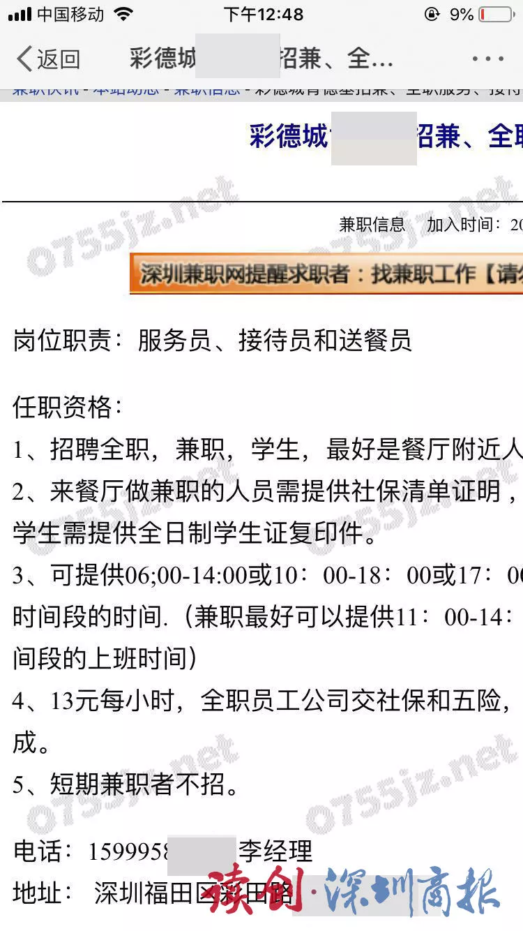 4月8日晚間,江女士在微博搜索“撿手機(jī)者”電話號碼,在深圳某知名連鎖餐廳發(fā)布的招聘信息中,無意中發(fā)現(xiàn)其的聯(lián)系電話。