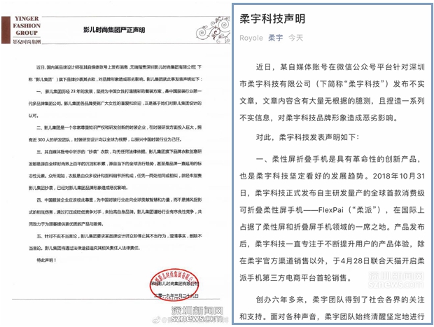 影兒時尚集團(tuán)(左)和柔宇科技(右)聲明頁面截圖