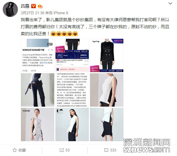 無獨(dú)有偶。5月5日,深圳影兒時尚集團(tuán)(以下簡稱:影兒集團(tuán))正式向深圳市中級人民法院提起訴訟請求,就超模呂燕多次在微博上指責(zé)影兒集團(tuán)是“抄抄集團(tuán)”,造成影兒集團(tuán)重大名譽(yù)損失和巨額經(jīng)濟(jì)損失一事,起訴超模呂燕及其公司上海是你商貿(mào)有限公司不正當(dāng)競爭,要求兩被告立即停止侵權(quán)行為,賠償經(jīng)濟(jì)損失1000萬元,并公開道歉。