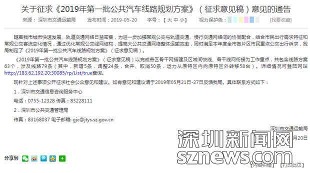 目前,市民可登陸網(wǎng)站http://jtys.sz.gov.cn/查詢詳細(xì)情況。同時(shí),深圳市交通運(yùn)輸局就上述事項(xiàng)公開征求社會(huì)公眾意見和建議,如有意見和建議請于2019年05月21日-27日反饋至深圳市交通運(yùn)輸局。具體聯(lián)系方式如下: