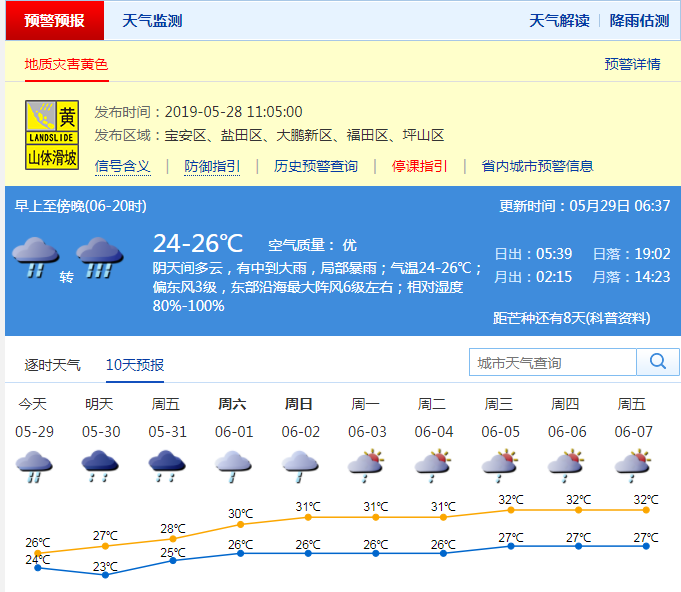 據(jù)氣象預(yù)報,29日白天有中到大雨,局部暴雨;30日有雷陣雨,局部大雨。;31日-6月1日有陣雨,部分時間雨勢稍大。需重點(diǎn)防御持續(xù)強(qiáng)降水引發(fā)的地質(zhì)災(zāi)害、城市積澇等次生災(zāi)害。