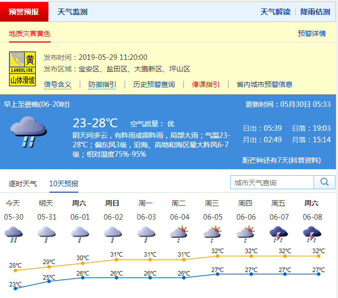 深圳新聞網(wǎng)5月30日訊 從上周開始,天氣預(yù)報(bào)就不斷提示:小雨、雷陣雨、暴雨。掐指一算,“龍舟水”又到了。深圳市氣象臺(tái)預(yù)計(jì),31日-6月3日,多云間陰天,有中到大雨。深圳人,你們最近可能真的需要一艘船!