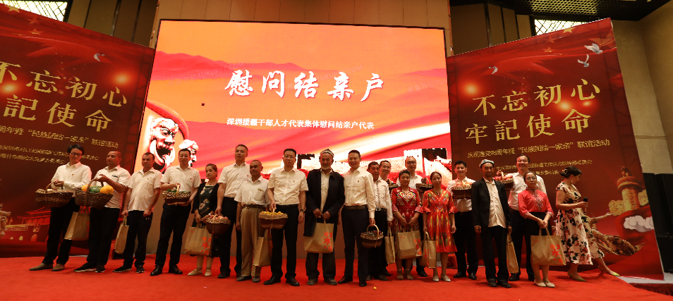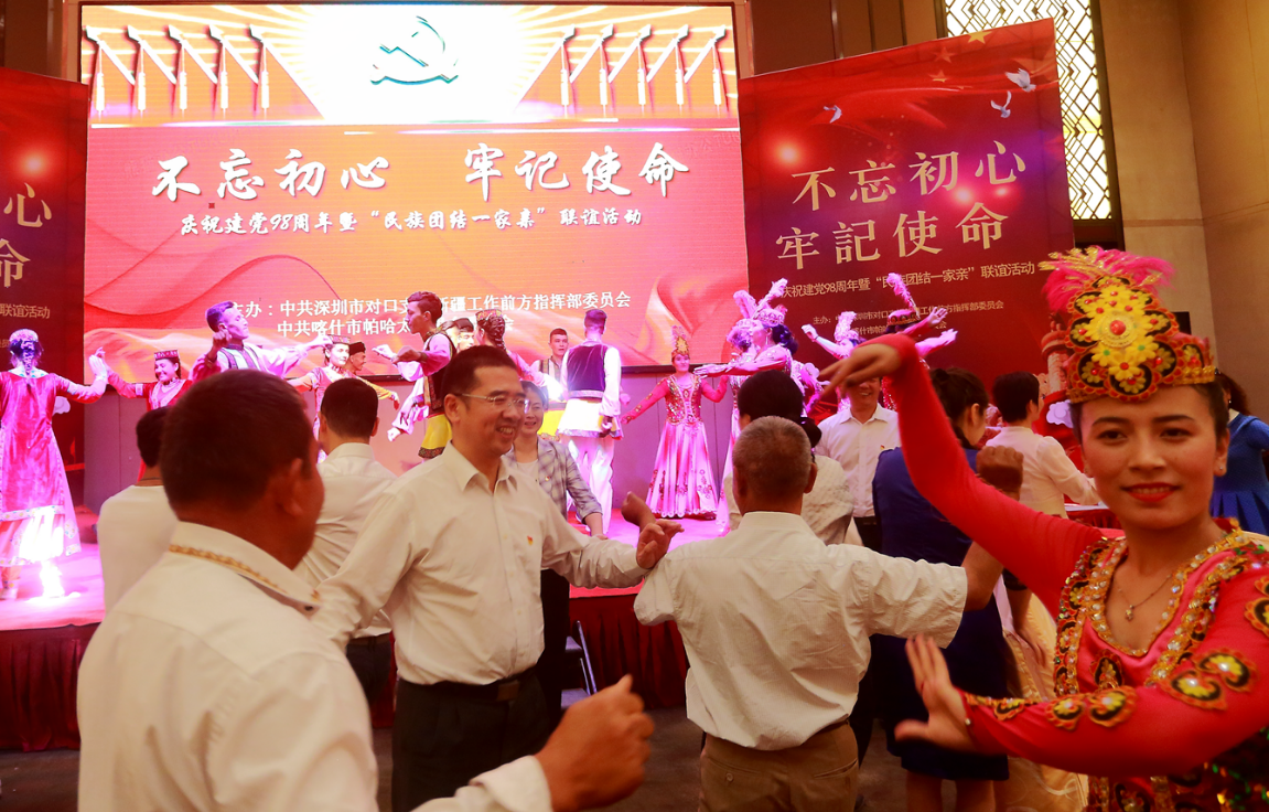 “歷史告訴我們,沒有共產(chǎn)黨,就沒有新中國;沒有共產(chǎn)黨,也沒有我們新疆各族人民今天的幸福生活,在這個(gè)特殊的日子里,讓我們繼續(xù)攜起手來,不忘初心,牢記使命,緊密團(tuán)結(jié)在以習(xí)近平同志為核心的黨中央周圍,聽黨話,跟黨走,挑起重?fù)?dān),勇當(dāng)尖兵,共同為實(shí)現(xiàn)新疆社會穩(wěn)定和長治久安總目標(biāo),為受援地打贏脫貧攻堅(jiān)戰(zhàn)而努力奮斗!”深圳援疆前方指揮部總指揮楊春生在致辭中說到。