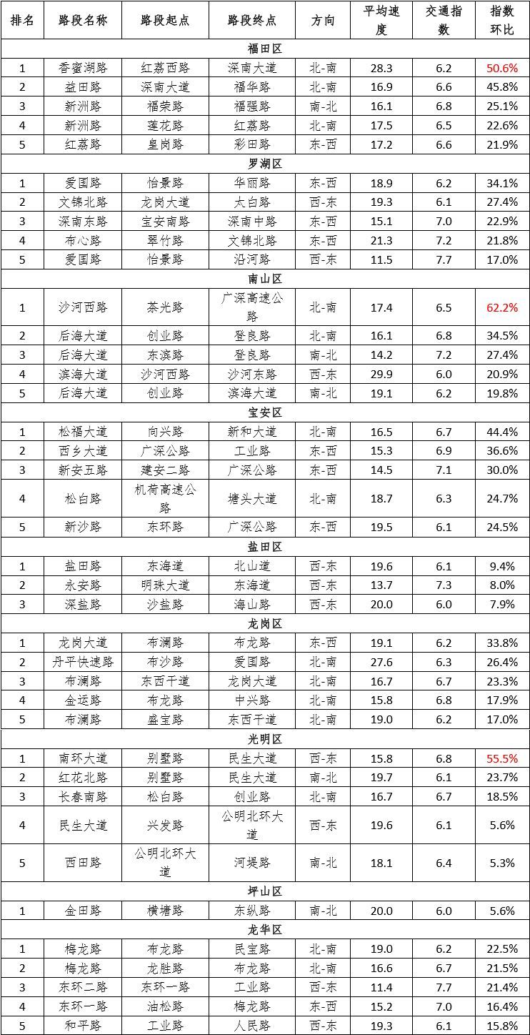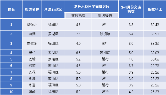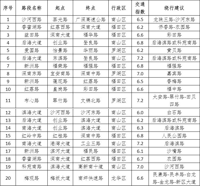 早高峰十大交通運行惡化街道:華強北、南湖、香蜜湖、翠竹、蓮塘、招商、蓮花、桃源、華富及園嶺。