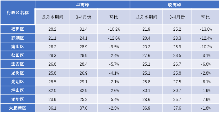 龍舟水天氣期間,各行政區(qū)工作日早、晚高峰時段運行速度較3-4月份(正常天氣情況)均呈現(xiàn)下降趨勢。早晚高峰時段最擁堵的行政區(qū)為羅湖區(qū),平均速度分別為21.1km/h、20.4km/h。