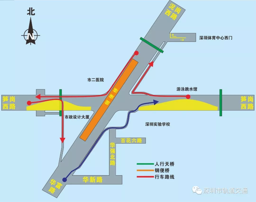 黃木崗路口南轉(zhuǎn)東向(華富路轉(zhuǎn)筍崗西路)、東轉(zhuǎn)北向(筍崗西路轉(zhuǎn)泥崗西路)不在通過(guò)平交路口,改為通過(guò)輔道進(jìn)行右轉(zhuǎn)。(詳見(jiàn)圖4)