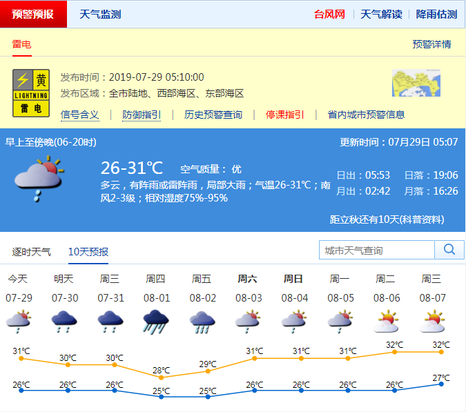 見圳客戶端·深圳新聞網(wǎng)2019年7月29日訊 今天多云有雷陣雨,局部大雨;26-31℃;南風(fēng)2-3級;濕度75%-95%。預(yù)計30-31日陰天間多云,有雷陣雨,局部暴雨;8月1日-2日有一次暴雨降雨過程;8月3日-5日降雨減弱,多云有陣雨或雷陣雨。