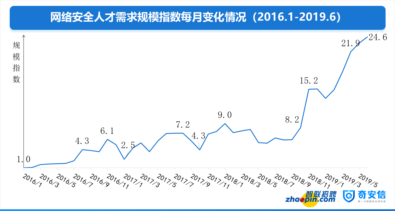 根據(jù)智聯(lián)招聘網(wǎng)絡(luò)安全人才大數(shù)據(jù)顯示,2019年6月網(wǎng)絡(luò)安全人才市場需求的規(guī)模達(dá)到2016年1月需求的24.6倍,相比2018年7月也增長了3倍,增長速度堪稱驚人!