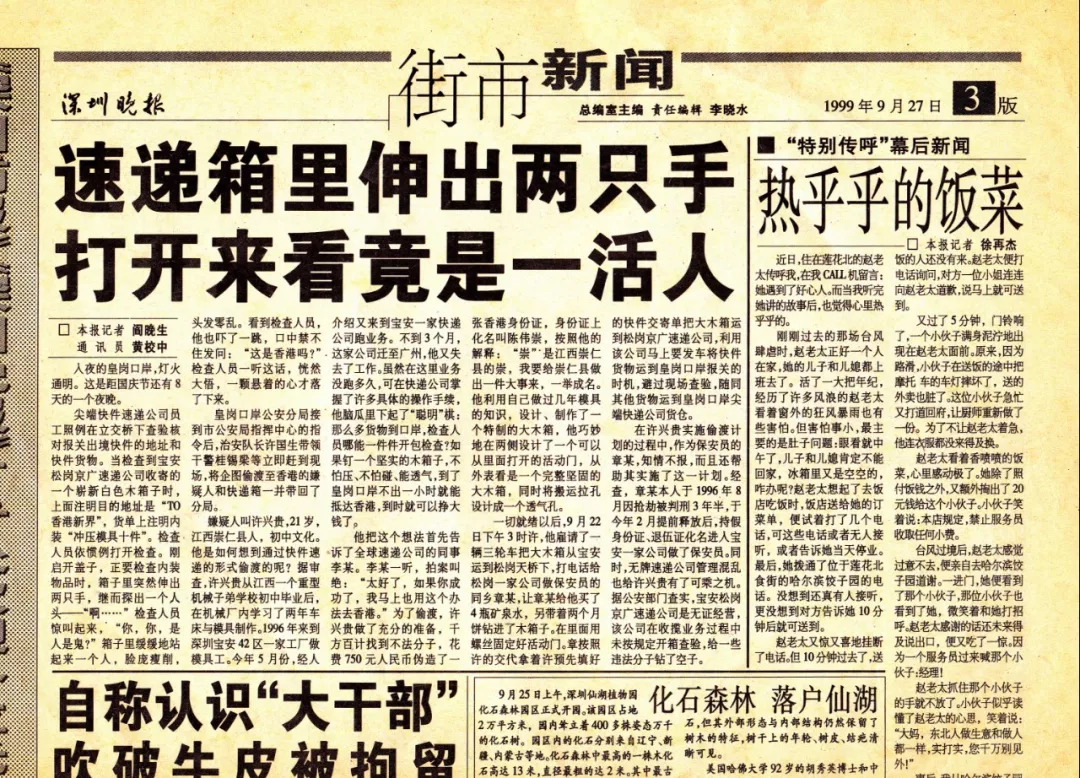 而歷史賦予這支鐵軍的特殊使命任務(wù)則是重拳打擊口岸走私和偷渡犯罪?;蕧徔诎杜沙鏊下毠す疱a梁至今還珍藏著一份些許泛黃的舊報(bào)紙,一篇名為“速遞箱里伸出兩只手,打開來看竟是一活人”的報(bào)道記錄了1999年9月22日曾發(fā)生的一起偷渡案件。作為當(dāng)時(shí)參與處置的一員,桂錫梁回憶道,犯罪分子將自己裝進(jìn)一個(gè)特制的大木箱中,偽裝成裝有“沖壓模具”發(fā)往香港的快遞箱,計(jì)劃偷渡出境,最終在位于皇崗口岸附近的快遞轉(zhuǎn)運(yùn)點(diǎn)被警方查獲。