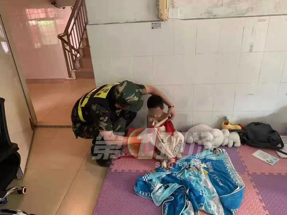 男童不斷哭泣,巡查隊(duì)員一邊安撫一邊將男童側(cè)身,慢慢地拉回屋內(nèi)。半分鐘左右,男童成功被救出,巡查隊(duì)員抱著男童安慰道,“沒(méi)事,不哭不哭,痛不痛,給你找件衣服穿下?!?/p>