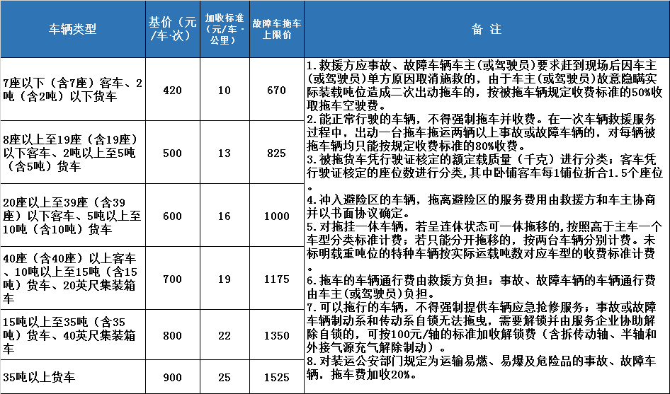 廣東省高速公路拖車服務(wù)收費(fèi)標(biāo)準(zhǔn)見下表: