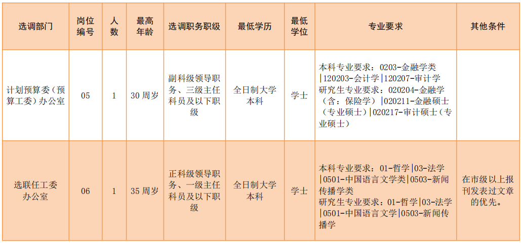 選調(diào)條件要求具有3年以上公務(wù)員工作經(jīng)歷(含試用期),已進(jìn)行公務(wù)員登記,且歷年公務(wù)員年度考核為稱職及以上等次。全日制普通高校大學(xué)本科以上學(xué)歷,學(xué)士以上學(xué)位。副科級領(lǐng)導(dǎo)職務(wù)、三級和四級主任科員、一級科員年齡在30周歲以下(1988年9月30日以后出生),正科級領(lǐng)導(dǎo)職務(wù)、一級和二級主任科員年齡在35周歲以下(1983年9月30日以后出生)等。