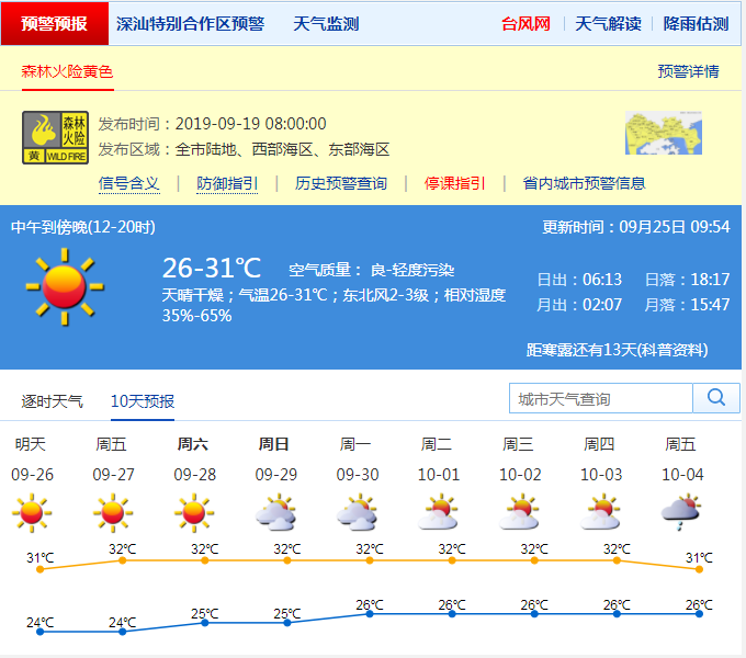 市氣象局預計26-28日持續(xù)天晴干燥,陽光充足,請注意防火用火安全;29-30日多云間晴天,偶有零星小雨;10月1-3日,晴間多云。