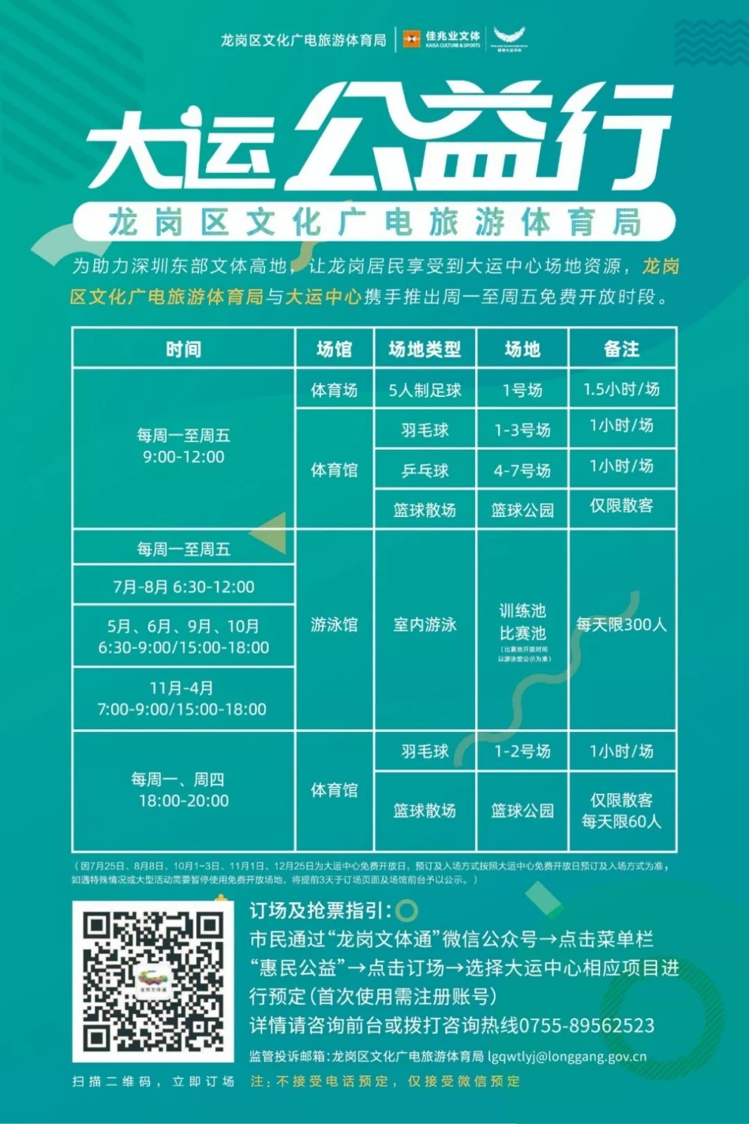 此外,龍崗區(qū)文化廣電旅游體育局與大運中心攜手推出的文體惠民開放項目周一至周五每天免費開放半天持續(xù)進(jìn)行中,具體時間及搶票攻略如下: