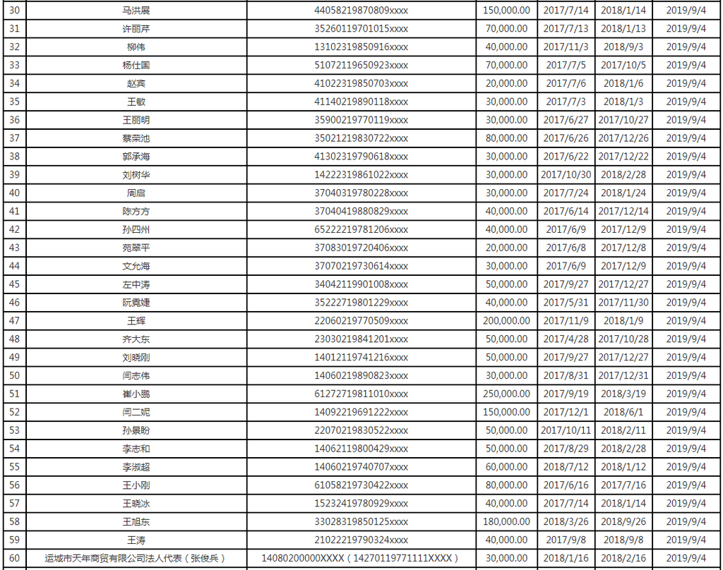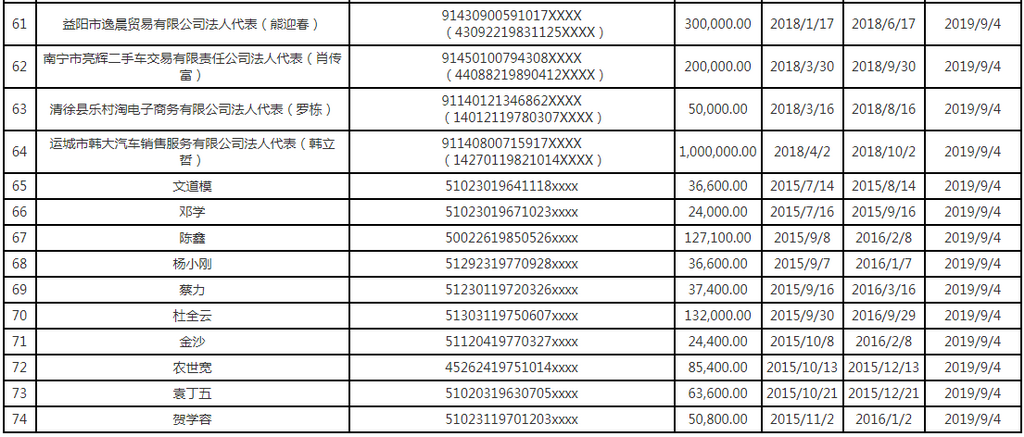 據(jù)深圳市地方金融監(jiān)督管理局披露的網(wǎng)絡(luò)借貸信息中介機(jī)構(gòu)失信人信息表顯示,74名失信網(wǎng)貸借款人中,有5名是企業(yè)的法人代表,分別為運(yùn)城市天年商貿(mào)有限公司法人代表張俊兵、益陽(yáng)市逸晨貿(mào)易有限公司法人代表熊迎春、南寧市亮輝二手車交易有限責(zé)任公司法人代表肖傳富、清徐縣樂(lè)村淘電子商務(wù)有限公司法人代表羅棟及運(yùn)城市韓大汽車銷售服務(wù)有限公司法人代表韓立哲。其中,運(yùn)城市韓大汽車銷售服務(wù)有限公司法人代表韓立哲逾期金額居首,達(dá)到了100萬(wàn)元,借款時(shí)間是2018年4月2日,逾期開(kāi)始時(shí)間是2018年10月2日,截至2019年10月9日已逾期一年多。