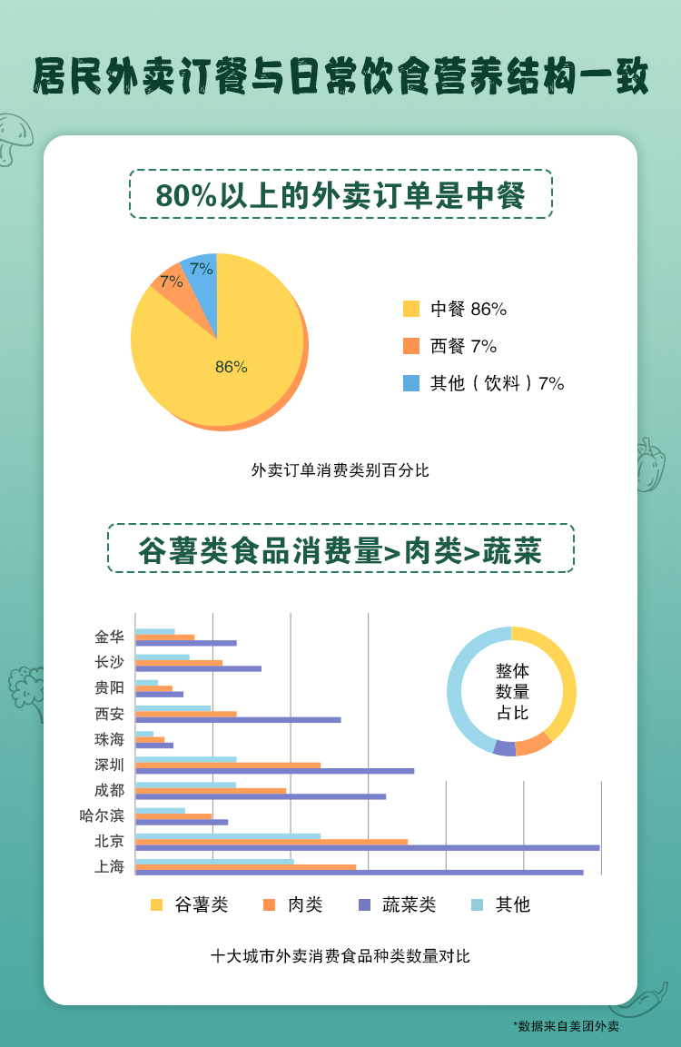 全國(guó)各地人民都是如何吃外賣的?中國(guó)農(nóng)業(yè)大學(xué)食品學(xué)院何計(jì)國(guó)團(tuán)隊(duì)的一向調(diào)查研究告訴了答案。該調(diào)查重點(diǎn)選取了我國(guó)外賣訂餐活躍的十個(gè)城市進(jìn)行了Top50消費(fèi)菜品的膳食結(jié)構(gòu)分析,通過(guò)大數(shù)據(jù)形式展示出了中國(guó)互聯(lián)網(wǎng)餐飲消費(fèi)的特征全貌,發(fā)現(xiàn)外賣用戶的飲食習(xí)慣和營(yíng)養(yǎng)結(jié)構(gòu)與國(guó)民普遍飲食習(xí)慣一致,如排名第一的訂餐時(shí)段是午餐,其次是夜宵、下午茶和晚餐;排名前三的餐品類別是中餐、甜品飲品和西餐。