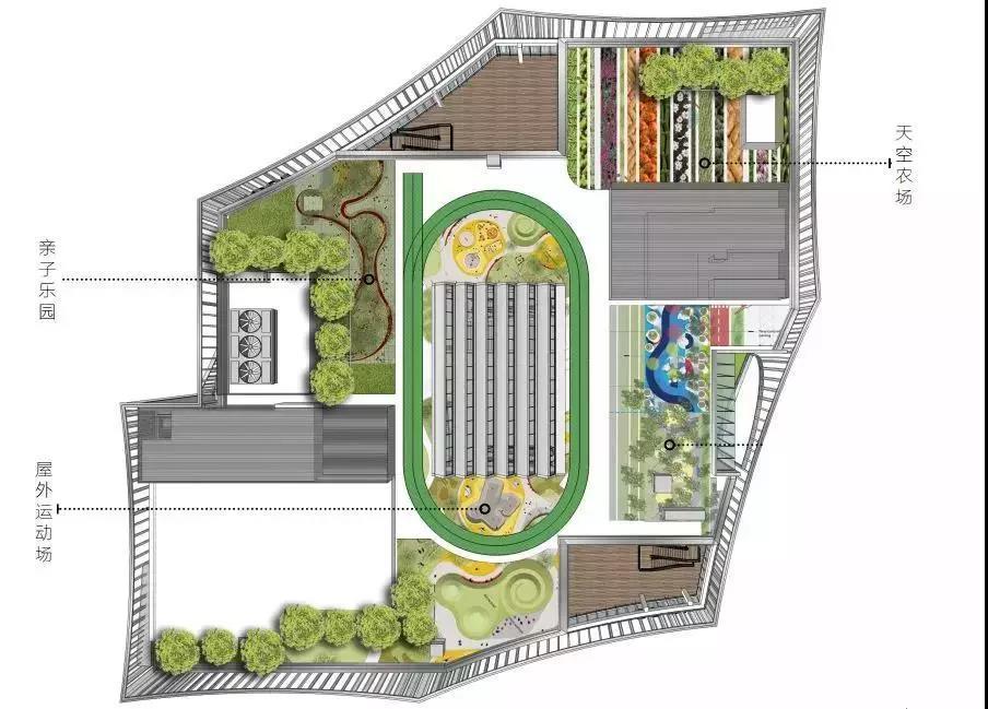 屋頂農場充分利用空間,打造天空農場、親子樂園、屋外運動場。空中的跑道,肥沃的土壤,瓜果蔬菜的金色豐收,讓自然在城市落地生根。小朋友們可以在其中,種植汗水,開花結果,收獲自然的饋贈。