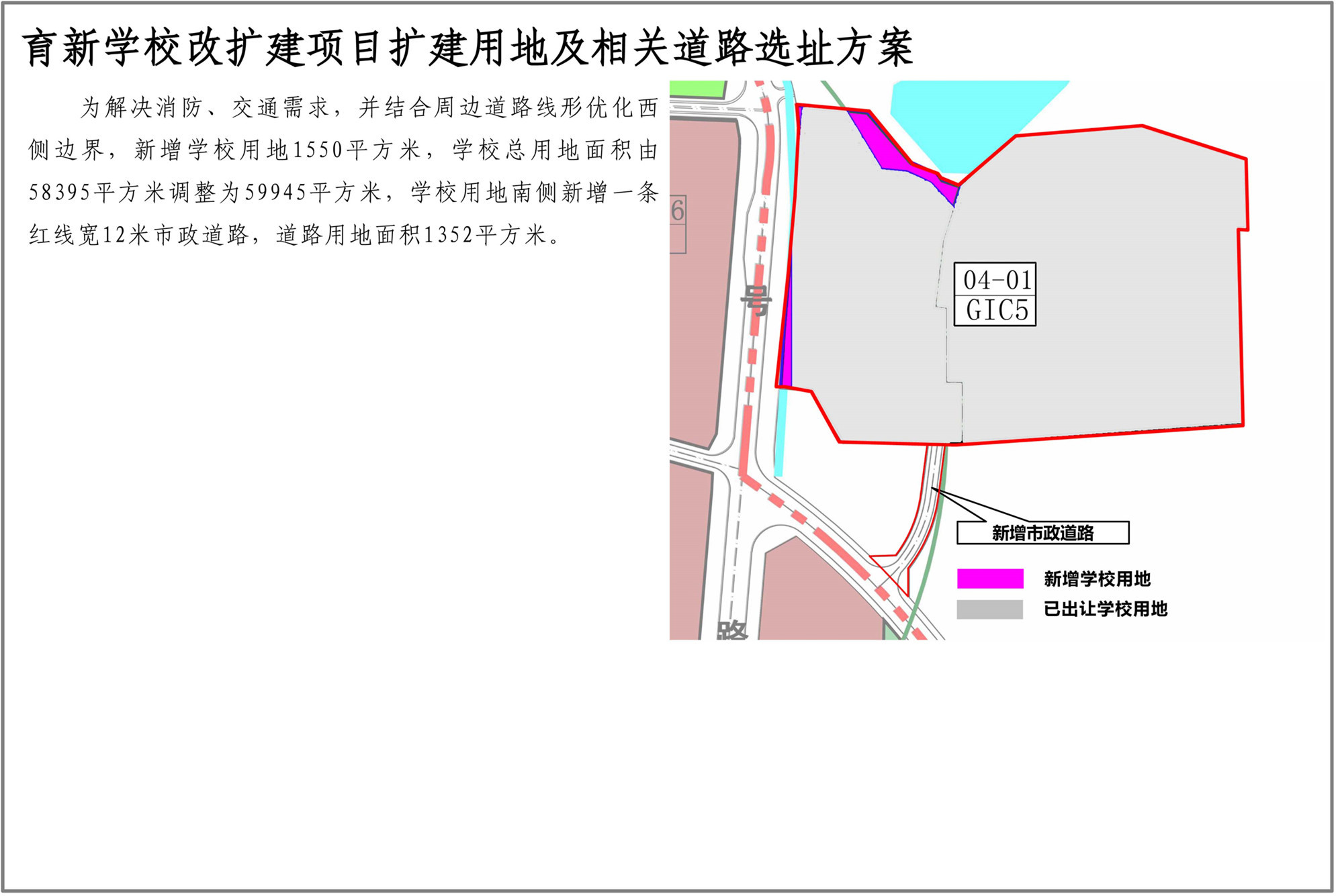 深圳市育新學(xué)校位于光明街道碧眼社區(qū),規(guī)劃觀光路(現(xiàn)狀已建)和二十三號路(現(xiàn)狀已建)交叉口西北側(cè)。為消除校園消防、交通出行安全隱患,滿足規(guī)范需求,新增學(xué)校用地1550平方米,以解決消防、交通需求,并結(jié)合周邊道路線形優(yōu)化西側(cè)邊界,學(xué)??傆玫孛娣e由58395平方米調(diào)整為59945平方米,學(xué)校用地南側(cè)新增一條紅線寬12米市政道路,道路用地面積1352平方米。