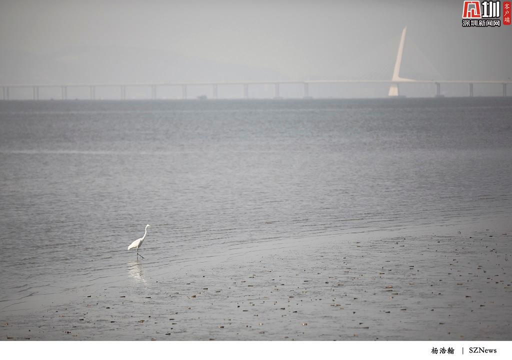 2019年10月17日,深圳灣公園,鳥類的白色羽毛和遠(yuǎn)處白色的深圳灣公路大橋,成了一景。